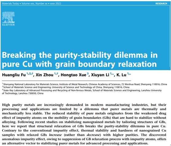 近期,兰州理工大学省部共建有色金属先进加工与再利用国家重点实验室薛红涛副研究员与中科院金属所沈阳材料科学国家研究中心卢柯院士团队合作的原创性研究成果“Breaking the purity-stability dilemma in pure Cu with grain boundary relaxation”在国际材料科学领域顶级期刊《MaterialsToday》(影响因子IF=31.041)在线发表。该研究工作是由国家重点实验室与沈阳材料科学国家研究中心合作完成,薛红涛博士为第三作者,参与完成了该成果中分子动力学模拟的研究工作,通讯作者为沈阳材料科学国家研究中心主任卢柯院士和我校柔性引进专家李秀艳研究员。